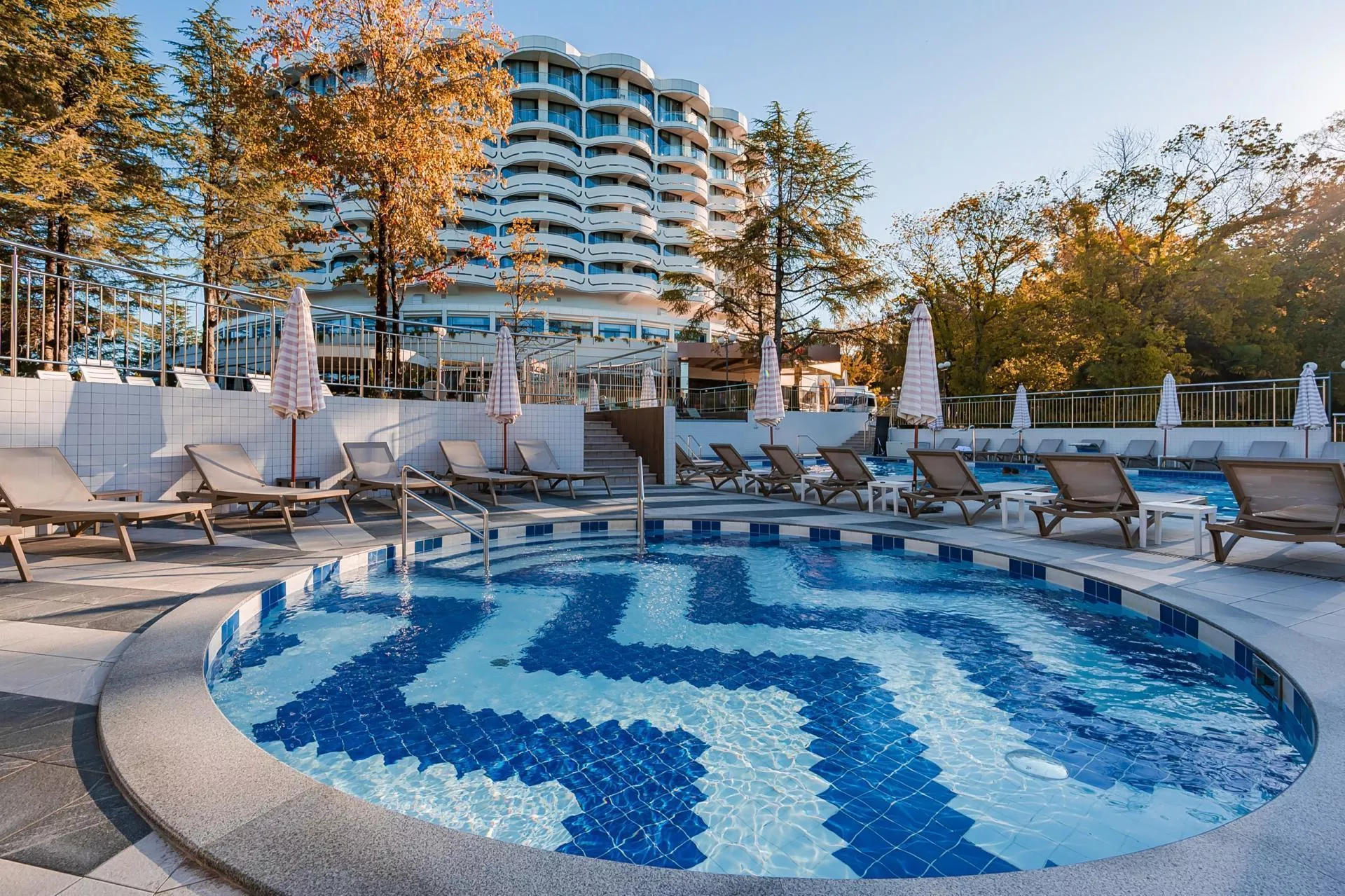 Круглогодичный открытый бассейн Cosmos Stay Le Rond Sochi создан для оздоровительного плавания, отдыха и релаксации на воде.
